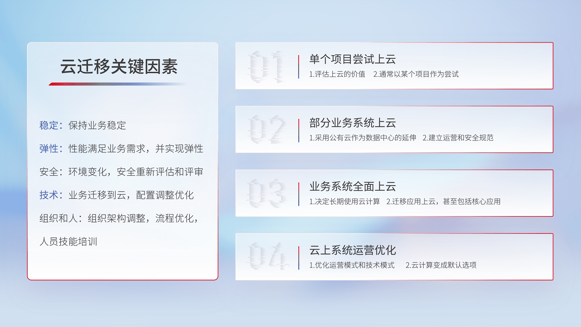 结合实际业务,,,,从规划设计、、云平台选型、、、、云原生改造、、、数据迁移、、、集成交付,,,迁移全过程为客户识别最佳上云路径,,,做好风险识别管理,,,设计网络架构、、、身份权限、、安全审计合规、、、操作审计、、日志审计、、、监控告警策略、、、多站点容灾设计等,,,,对云上基础设施进行整体规划,,,提升IT治理水平,,以满足弹性、、、高可用、、、、高性能的需求。。。