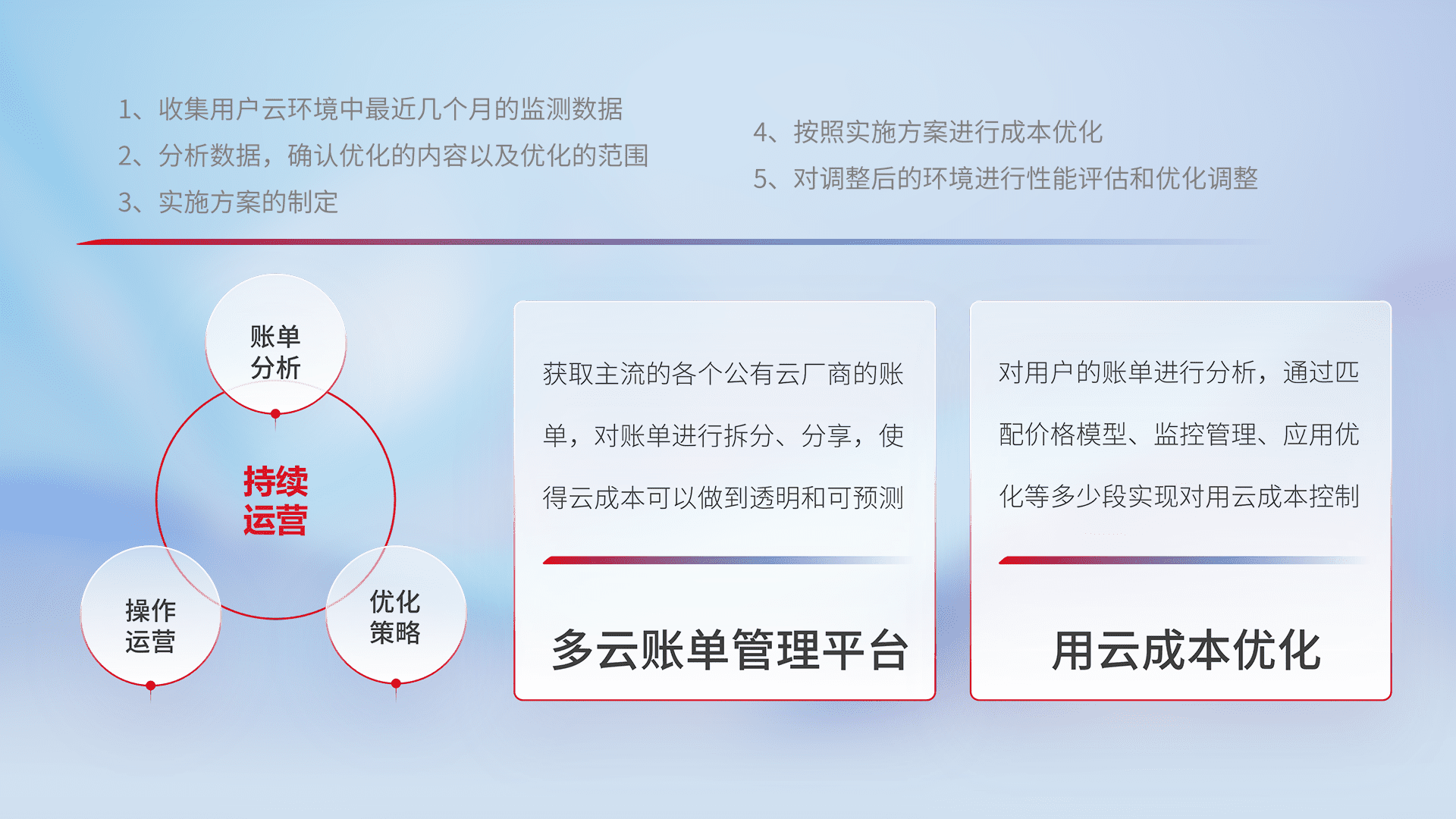 通过多云纳管,,以统一的资源数据模型把客户的云资源进行抽象和封装,,,进而实现对多云资源的统一操作,,,保障云资源管理的可靠性、、、、稳定性与可用性。。。量身定制化运维内容,,,配置、、开发运维、、补丁管理、、、、备份、、、监控、、、、认证和访问管理、、审计和日常巡检等,,保障在用云过程中的可靠度,,稳定度以及高可用率。。